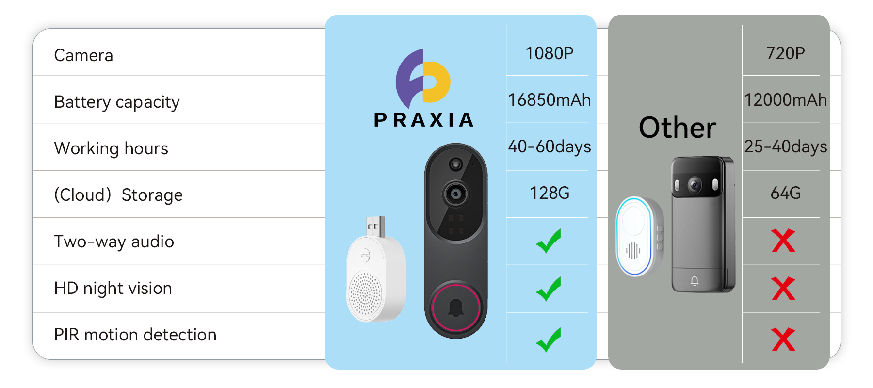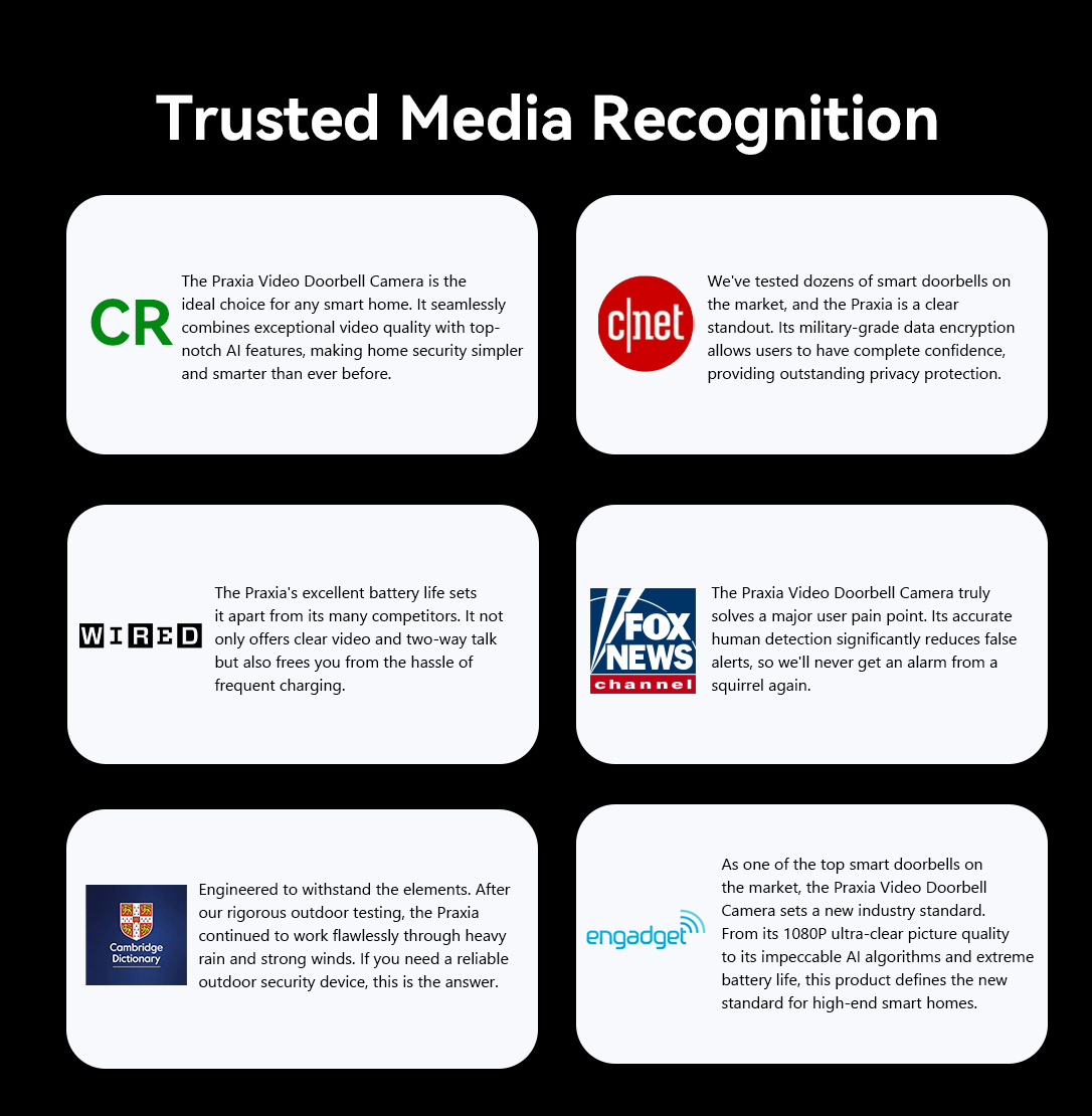 The Praxia Video Doorbell Camera was the result. With advanced AI detection and HD night vision, it ensures your home is reliably protected, day and night. Praxia's core mission is to never let you down and to always keep your family safe.